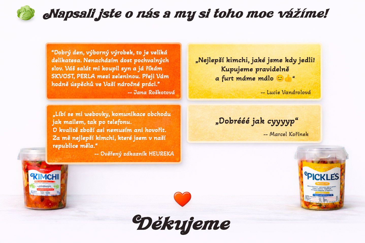 Dnes stojí za Czech Kimchi nejen my dva, ale i naše rodina a přátelé, kteří se stali součástí výroby. Náš závazek zůstává stejný jako na začátku: kvalitní suroviny, poctivá práce a chuť, která si poradí s časem i konkurencí.