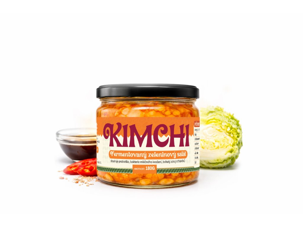 Naše kimchi je ručně vyráběno procesem fermentace (kvašení) z kvalitních surovin: pekingské zelí, mrkev, bílá ředkev Daikon, cibule, zázvor, česnek, korejské chilli Gochugaru, jablka, jarní cibulka, rýžová mouka, třtinový cukr, mořská sůl a sojová omáčka (Kikkoman). Tento produkt neobsahuje žádné konzervanty ani stabilizátory, a přirozená konzervace je zajištěna mléčným kvašením, díky kterému kimchi postupem času získává intenzivnější chuť.