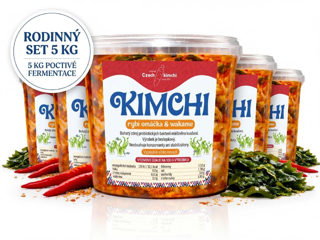 Zásobte svou lednici zdravím za nejlepší cenu! Naše nejprodávanější Kimchi s rybí omáčkou a řasou wakame jsme pro vás připravili do extra výhodného setu 5 kusů. Je to ideální volba pro velké rodiny, zapálené milovníky fermentace nebo komunitní nákup s přáteli.