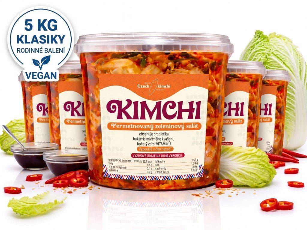 Zásoba zdraví pro celou domácnost! Naše Kimchi se sójovou omáčkou je připraveno pro ty, kteří preferují jemnější chuť bez rybího základu. V tomto velkém rodinném balení (5× 1 kg) získáte dostatečnou zásobu živých probiotik, která podpoří imunitu a trávení všech členů rodiny.